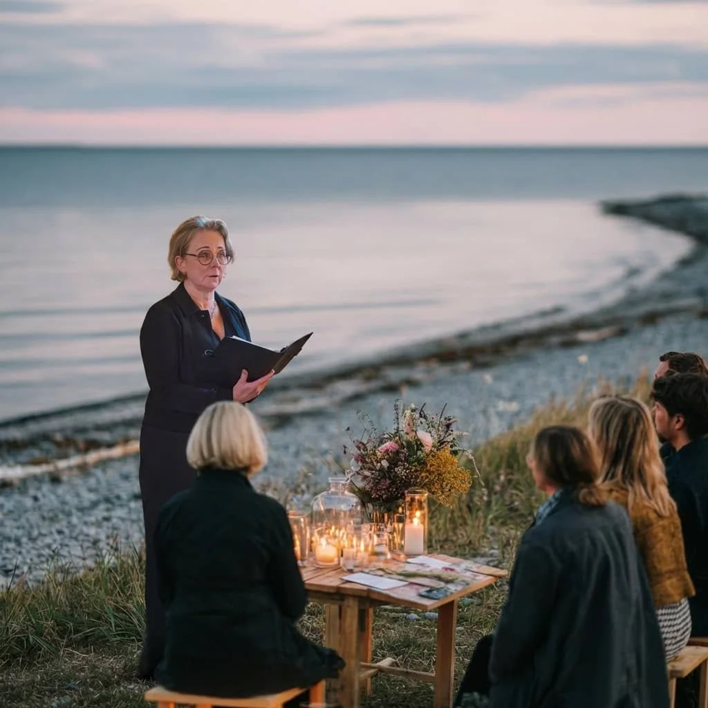 Den borgerliga officianten håller denna ram. Ser till att ceremonin får den värdighet som varje avsked förtjänar, utan att värdigheten blir en tvångströja. Navigerar mellan det högtidliga och det vardagliga, mellan tårarna och skratten, mellan det offentliga och det djupt privata.
